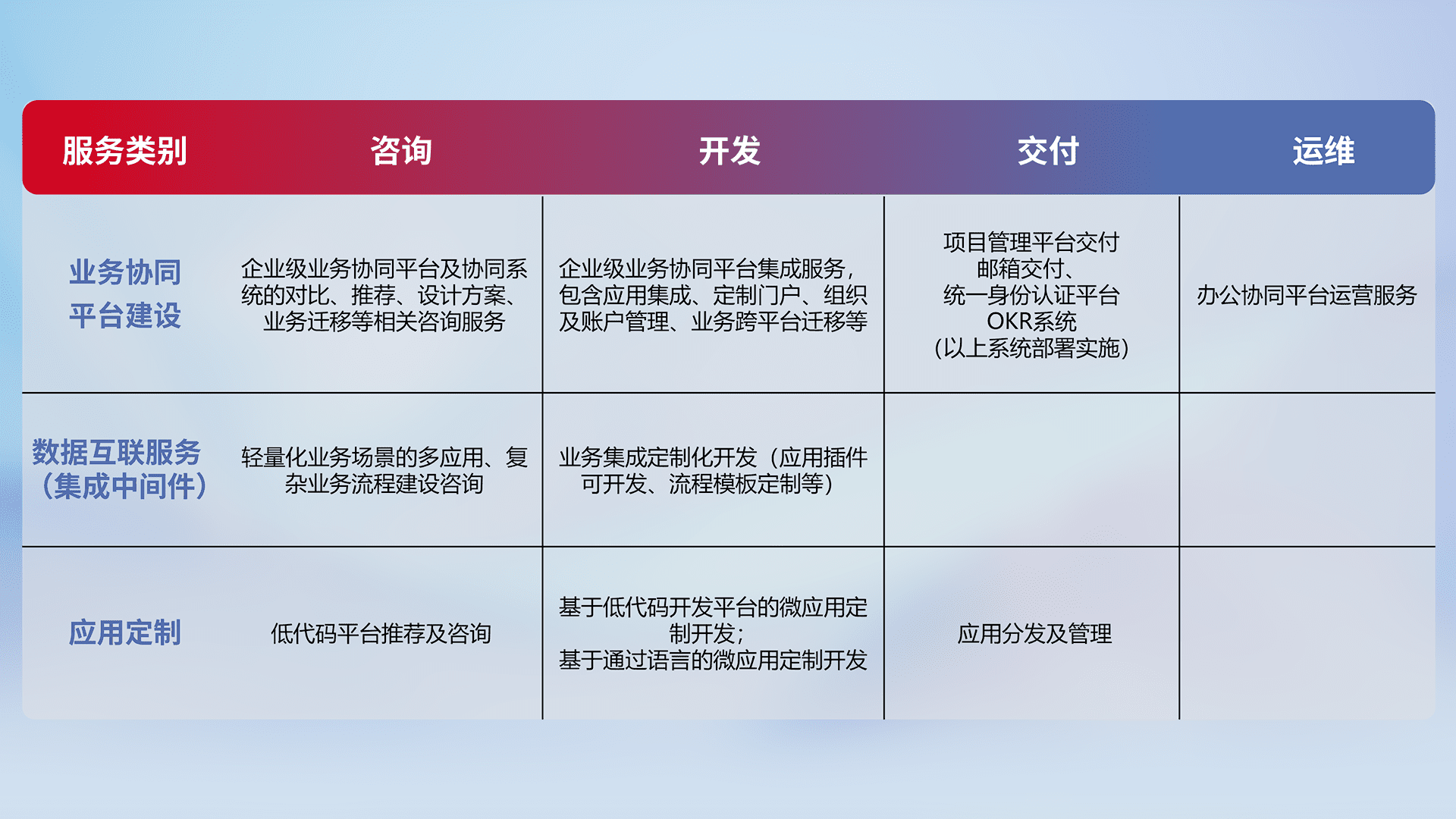 针对钉钉、、企微、、、、IDaas等平台级产品提供产品的规划、、方案、、、、交付、、定制化开发等服务,,,实现如统一协同办公、、智能客户服务、、混合会议管理、、、智能数据查询、、、、等业务场景,,,实现数字化转型。。。